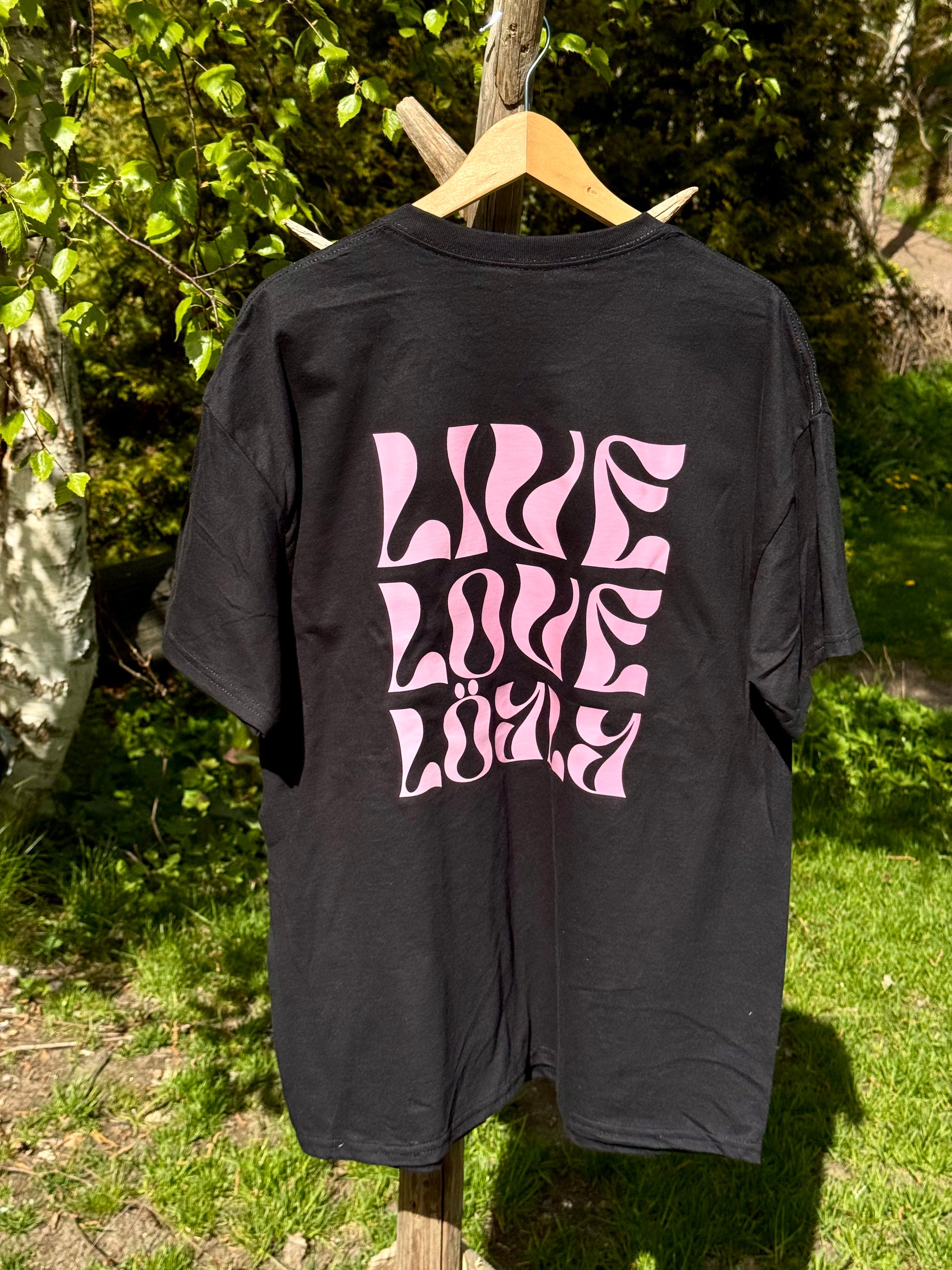 Upea musta t-paita pastellin pinkillä logolla rinnassa ja selässä. Tällä t-paidalla keräät kateellisia katseita ja muistutat itseäsi elämää ohjaavalla mantralla.